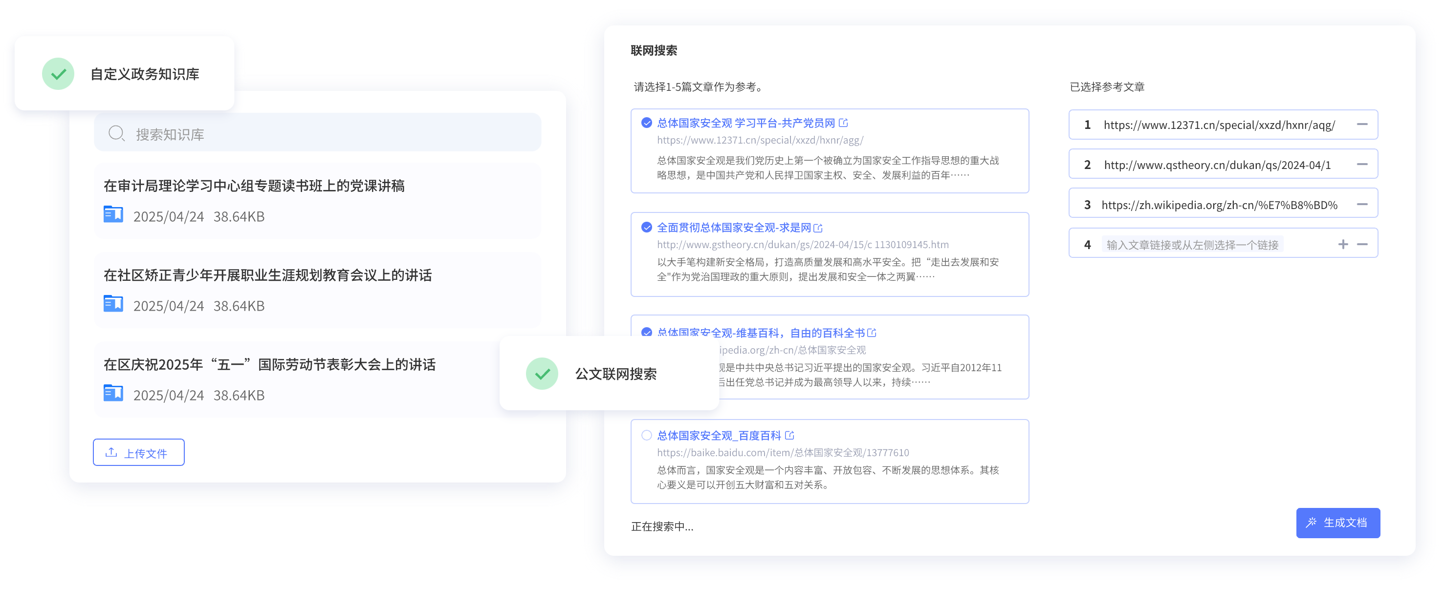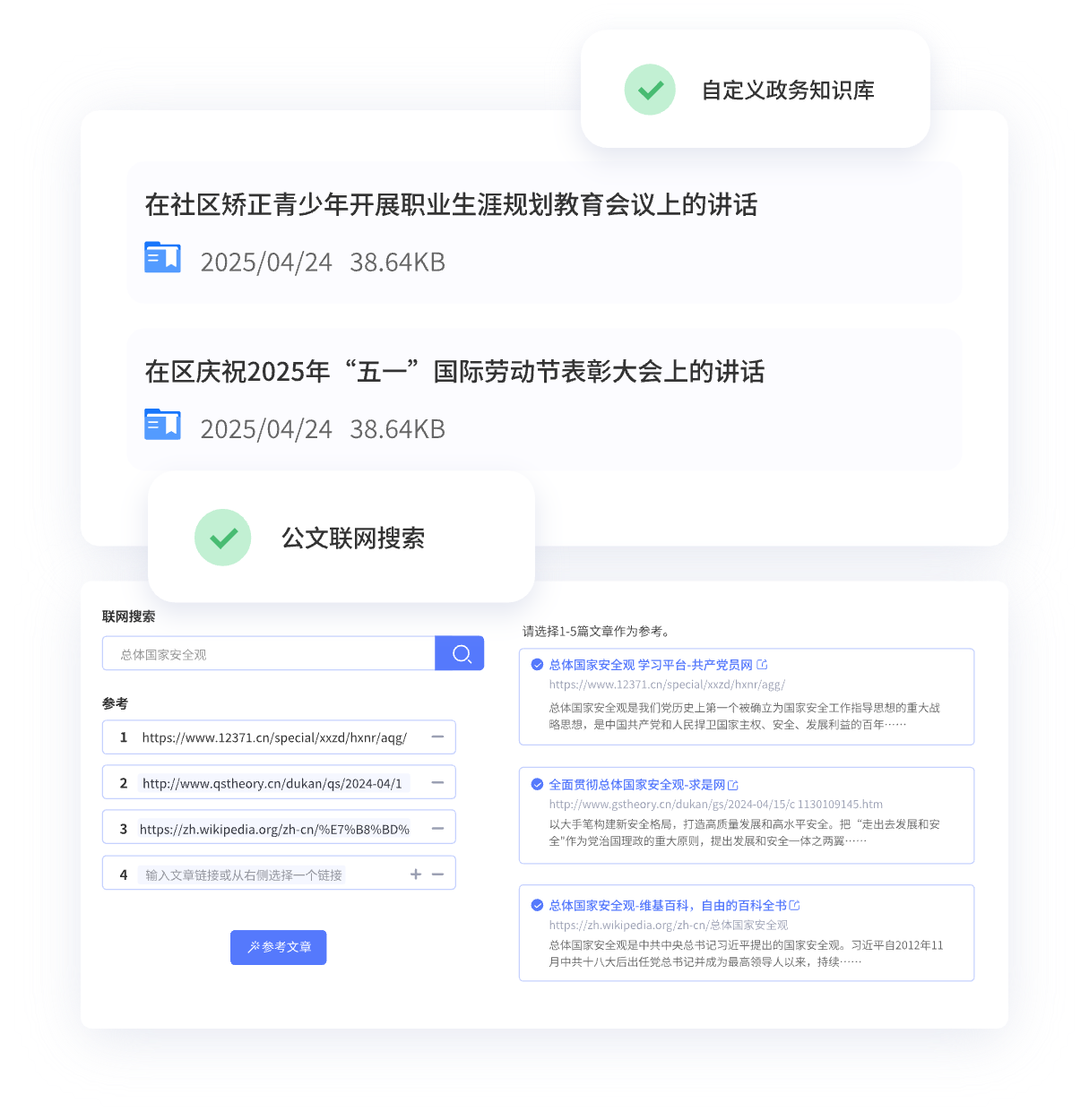 上傳政務(wù)或個(gè)人寫(xiě)作常用材料,用于精準(zhǔn)生成符合自己寫(xiě)作風(fēng)格的公文